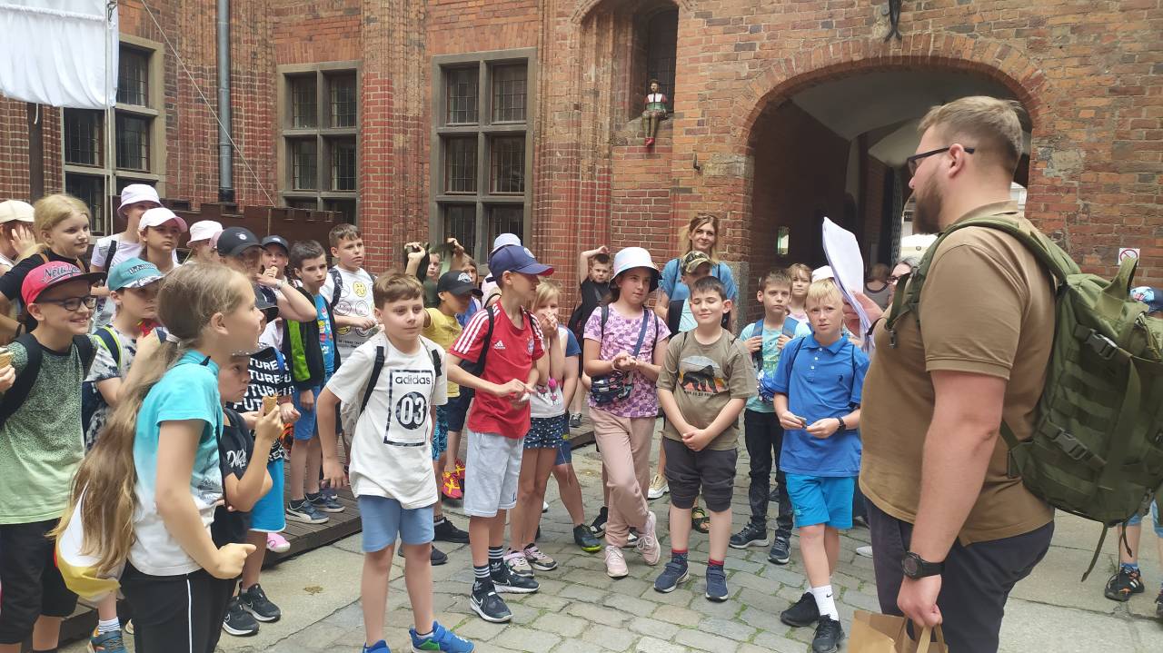 Kolejną wycieczką dofinansowaną przez Ministra Edukacji i Nauki była całodzienna wycieczka do Torunia, dla klas III d i III e. Odbyła się 19 czerwca 2023 r. Program wycieczki był bardzo bogaty. Dzieci zwiedziły z przewodnikiem Stare Miasto. W czasie spaceru zobaczyły m.in.: Bramę Klasztorną, Krzywą Wieżę, mury obronne Starego Miasta, Dom Mikołaja Kopernika (zwiedzanie z zewnątrz), Katedrę św. Jana Chrzciciela i św. Jana Ewangelisty, pomnik Mikołaja Kopernika, “pręgierz” osiołek, Ratusz Staromiejski, fontannę Flisak, Kamienicę Pod Gwiazdą oraz Piernikową Aleję Gwiazd. Dodatkową atrakcją wędrówki po toruńskich ulicach była przygotowana specjalnie dla uczniów gra miejska. Przestrzeń Starego Miasta stała się planszą, uczestnicy graczami, a przewodnik moderatorem gry. Dzięki takiemu rozwiązaniu dzieci przez zabawę lepiej poznały miasto, jego historię, zabytki oraz ciekawostki. Po grze uczestnicy wycieczki brali udział w warsztatach wypieku piernika w jednej z toruńskich piernikarni pod zabawną nazwą „Muzeum Historii Partaczy”. Uczniowie pod bacznym okiem Mistrza Piernikarskiego oraz Wiedźmy Korzennej, przenieśli się do czasów średniowiecznego Torunia i stali się prawdziwymi terminatorami, czyli uczniami piernikarskimi. Wszyscy brali czynny udział we własnoręcznym przygotowaniu ciasta i późniejszym wypieku. Każdy uczestnik warsztatów otrzymał na pamiątkę własnoręcznie wypieczony przez siebie piernik. Ostatnią atrakcją wycieczki był seans w Planetarium.
