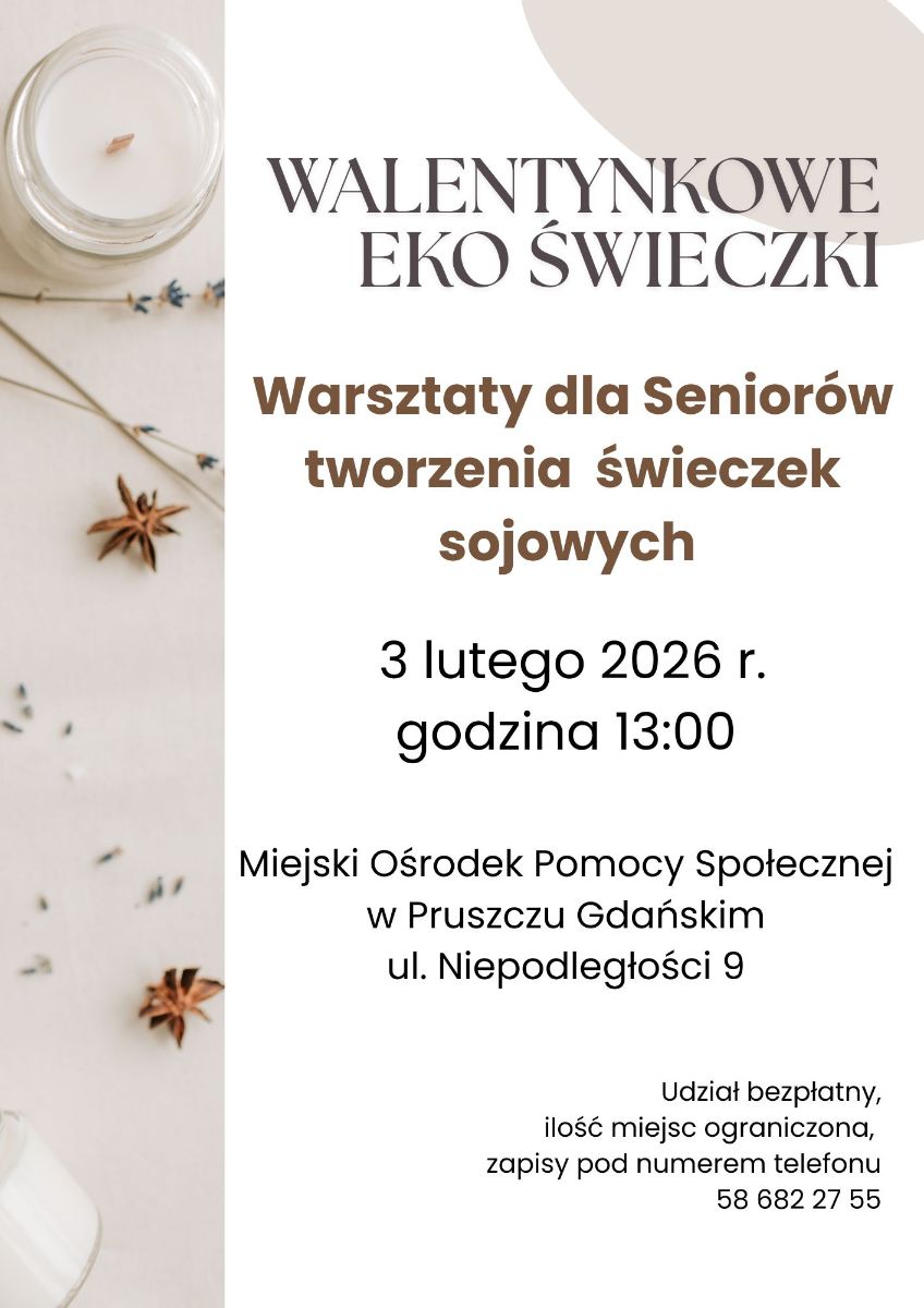 Miejski Ośrodek Pomocy Społecznej w Pruszczu Gdańskim zaprasza na bezpłatne warsztaty dla seniorów tworzenia świeczek sojowych "Walentynkowe Eko Świeczki".