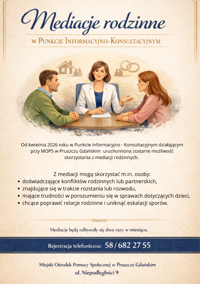 Od kwietnia 2026 roku w Punkcie Informacyjno-Konsultacyjnym działającym przy MOPS w Pruszczu Gdańskim uruchomiona zostanie możliwość skorzystania z mediacji rodzinnych.